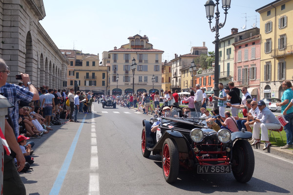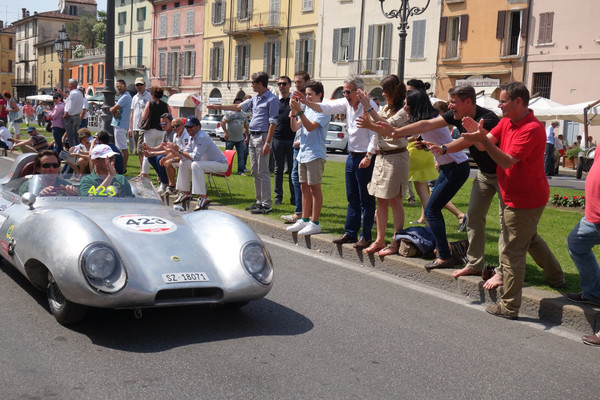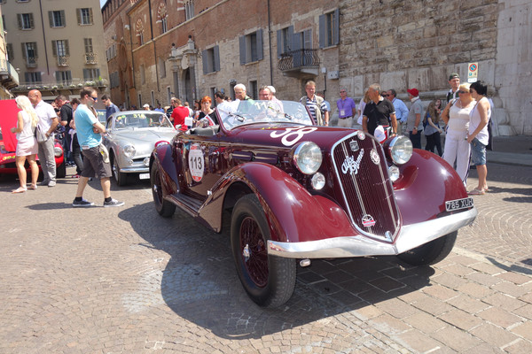 Das Zentrum Brescias war erfüllt vom Menschengewirr und der nicht enden wollenden Reihe historischer Autos, die auf dem abgesperrten zentralen Platz registriert wurden. Unsere kleine Gruppe trennte sich, nachdem ein Treffpunkt zu einer späteren Stunde vereinbart worden war. Man wühlte sich durch die Menschenmenge, um möglichst nah an die Absperrungen zu kommen. Später parkten die registrierten Wagen bis zum Start in den Straßen. So hatten wir viel Zeit, die Kostbarkeiten aus nächster Nähe zu bewundern. Historische Autos in historischer Umgebung – eine geniale Symbiose!