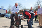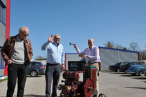 Auf dem Hof hatte Peter B. wieder seinen in Tschechien erworbenen Einzylinder-Motor aufgebaut. Auch hieß es wieder, dass dieser an den letzten beiden Tagen wunderbar gelaufen sei. Es kam, wie es kommen musste. Der Motor sprang nicht an. Viele versuchten sich an der Handkurbel; nach gut 30 Minuten gelang es dann tatsächlich, das gute Stücke zum Leben zu erwecken.