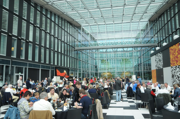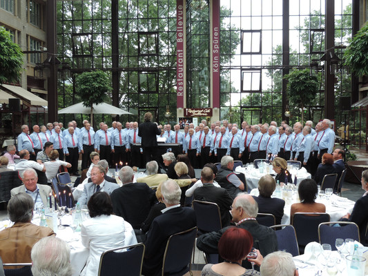 Um 19 Uhr war zum Empfang und Essen in die große Halle des Maritim geladen. Ein "Kölsches Buffett" und der Männerchor der Deutz AG (der ersten Motorenfabrik, deren Firmengründer, Nicolaus August Otto, den ersten funktionsfähigen Viertaktmotor entwickelte) stimmten die Teilnehmer auf das Rheinland ein. Im Anschluss gab es noch ein kurzes Fahrerbriefing. Speisen und Getränke dieses Abends wurden von einem Mitglied der Landesgruppe Rheinland spendiert. Dafür an dieser Stelle ein herzliches Dankeschön.