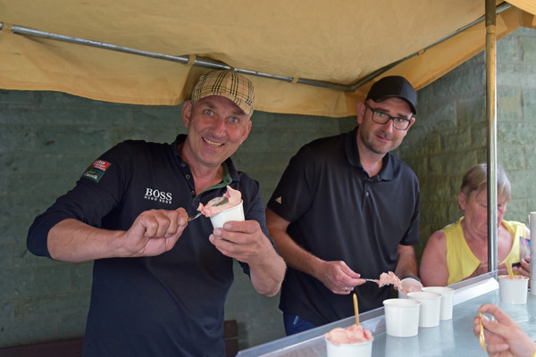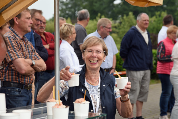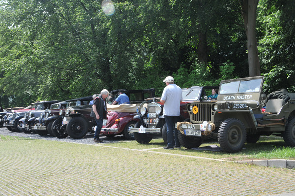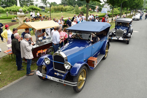 Am zweiten Fahrtag dirigierte das Roadbook, sorgfältig ausgearbeitet von SB Helmut Auge, in die Region um Geseke und Soest. Unter optimalen Bedingungen rollten die alten Schnauferl mühelos durch die Landschaft. Highlight der Tagesetappe war die Durchfahrt durch den Ort Verlar. Vor der Haustüre von SB Kalli Behlau waren Bänke entlang der Straße aufgebaut und hier drängten sich begeisterte Zuschauer, die einen Blick auf die wunderschönen Oldtimer werfen wollten. Fahrer und Beifahrer wurden mit bestem italienischem Eis versorgt, Johannes Hübner begrüßte die Teams und moderierte das Szenario, Fotografen der örtlichen Presse feuerten ein Blitzlichtgewitter nach dem anderen ab und sogar eine Blaskapelle spielte mit zünftiger Musik auf.