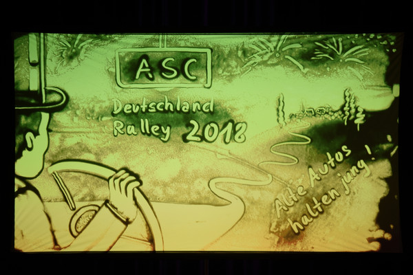 Auf das abwechslungsreiche Rallye-Wochenende setzte der Festabend im Kongresszentrum dann den krönenden Abschluss! SB Wolfgang Auge hatte ein emotionsgeladenes Unterhaltungsprogramm gesponsert: der Seifenblasenkünstler „Blubb“ begeisterte die Gäste mit einer tollen Vorführung und die Sandmalerei der Künstlerin „Sabrina“ sorgte für Gänsehaut. Über Tische und Bänke ging es bei dem Auftritt der „Euro Kids“, einem energiegeladenen Gesangsquartett. Zur Musik eines DJ’s (besser gesagt einer „DJ’line“) wurde bis spät in die Nacht getanzt. Die Siegerehrung war von Wolfgang Presinger knackig moderiert und die Pokalübergabe durch den Sportpräsidenten des ASC, Carl Michael Emer, wurde im richtigen Zeitrahmen zelebriert.
