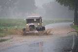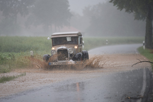 Mit jedem gefahrenen Meter zog am Nachmittag eine gewaltige Schlechtwetterfront näher und das einsetzende Gewitter glich einem Weltuntergangsszenario: riesige Wolkenberge türmten sich auf und machten innerhalb weniger Sekunden den Tag zur Nacht. Sturmböen peitschten Regen, Laub und Äste über die Felder. Kanalisation, Bäche und Gräben konnten die Wassermassen nicht bewältigen und die Straßen wurden mit Schlamm und Geröll überflutet.