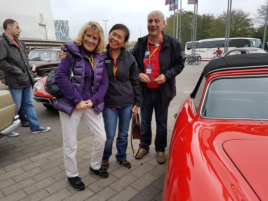 Die weitere Fahrt durchs Alte Land, das größte geschlossene Obstanbaugebiet Europas, ist auch für uns Hamburger immer wieder wunderschön. Eine einmalige Idee erwartete uns auf dem 'Herzapfelhof' in Jork. Dort erhielt jeder einen Apfel mit dem Logo der Rallye nicht etwa auf, sondern in der Schale der Äpfel quasi eingewachsen. Wie das wohl funktioniert? Leider war das Wetter so feucht, dass die schön polierten Autos von dem vielen Schmutz, den die kleinen Traktoren mit den bis zu fünf Anhägern voller Äpfel von den Feldern auf den kleinen Nebenwegen verteilt hatten, nicht mehr so glänzend die letzte Stempelkontrolle im Neuen Wall (!) bei absolutem Hochbetrieb passierten. Hier brachte der Stau sogar Spaß. Nach der sicher rein zufällig auch auf der Rückfahrt wiederrum 43ten Ampel im Stadtgebiet war das Ziel vor der Messehalle erreicht.