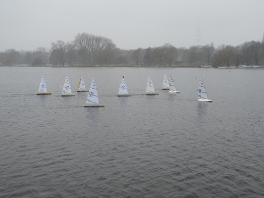 Echte Segelboote waren nicht zu sehen, da die Alster im Winter 'bootsfrei' sein muss. Die Segler des NRV, die es auch in der kalten Jahreszeit nicht ohne Boote aushalten, trafen sich an diesem Sonntag mit ihren ferngelenkten Segelbooten und trugen eine Spaßregatta unter Leitung des langjährigen NRV Regattaleiters 'Triple H' aus.