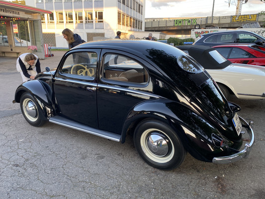 Dann fuhr Oliver mit einem schwarzen Brezel-Käfer vor (Typ 11, Bj. 06/1950, Hubraum: 1131 ccm, 24,5 PS, Special Edition Wolfsburg, Höchstgeschwindigkeit: 100km/h). Ein Auto wie aus dem Ei gepellt .