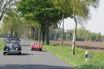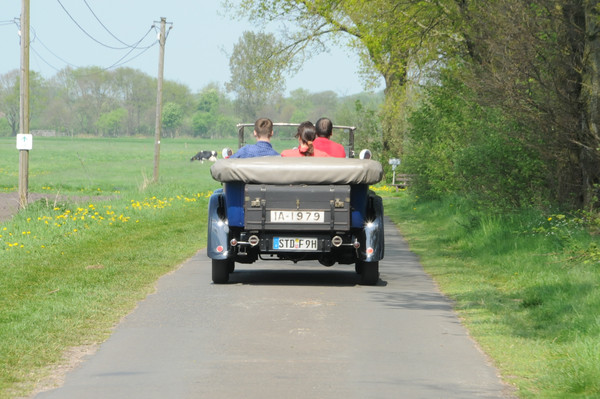Durch Alleen von Apfelbäumen, über Felder und entlang den Deichen, deren Grasnarbe durch Schafe gefestigt wurde, ging es zum 'Gut Deinster Mühle'. Statt zum Essen zu gehen, wurde vorerst das grandiose Wetter auf der Wiese genutzt, um die Fahrzeuge zu begutachten und Benzingespräche zu führen.