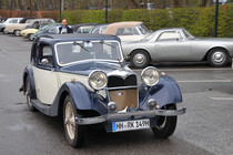 Nun ging es endlich los (mittlerweile hatte es angefangen zu regnen). Entlang der Elbe fuhren die Teilnehmer über Blankenese und Wedel zum Flugplatz Uetersen. Hier waren zwei weitere Wertungsprüfungen zu absolvieren. Gezeigt wurde ein Bild mit 7 der Peanuts Comic-Figuren. 4 waren hiervon namentlich zu nennen. Snoopy und Mr. Brown (der Vorname Charlie war schon schwieriger) waren noch am bekanntesten. Ferner wurde ein Bild des 'Adler Standard 6' von Clärenore Stinnes gezeigt. Nachdem dieses wieder weggenommen wurde, sollte man die Anzahl der Federn des Adlers des Firmenlogos nennen, der oben rechts auf dem Bild abgebildet war. Großes Problem! Es waren 8! Diese Frage konnte nur von 9 Teams korrekt beantworten werden. Den kreativen Antworten waren keine Grenzen gesetzt und mit 1,2 Mio. Federn wurde von einem Teilnehmer die richtige Antwort nur knapp verfehlt.