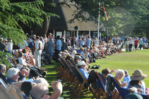 Kurz vor 18 Uhr endete das Spiel und mit dem 18 Uhr Glockenschlag von Big Ben konnte man den typischen Klang des 12 Zylinder Rolls Royce Merlin Motors (27 Liter Hubraum, frühe Motoren hatten 1.000 und die letzten Motoren gut 2.000 PS) vernehmen, der eine Spitfire antrieb, die nur wenige Meter über den Baumkronen flog. Das Ganze umringt von hunderten Zuschauern, die am Ende der 15 minütigen Flugshow alle begeistert waren. In Deutschland wäre so eine Demonstration undenkbar - jedoch werden auch in England die Vorschriften strikter. Im letzten Jahr flog die Spitfire unterhalb der Baumkronen über das Cricket Feld (siehe Goodwood 2014 Bericht auf der Homepage der LG Hammonia). Dieses Jahr erfolgte der Überflug auf Höhe der Baumkronen.