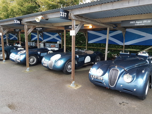 60 Jahre Platz 1+2 in Le Mans 1957: Parade von 25 Rennwagen in der besonderen Farbe 'Saltire Blue' nebst Renntransporter der 'Ecurie Ecosse' = 'Scottish Stable', dem berühmten Schottischen Rennstall, für den auch Sir Jackie Stewart fuhr und natürlich vor Ort war.