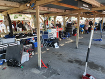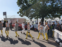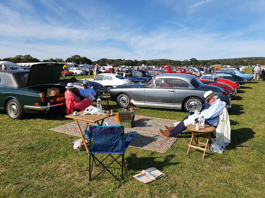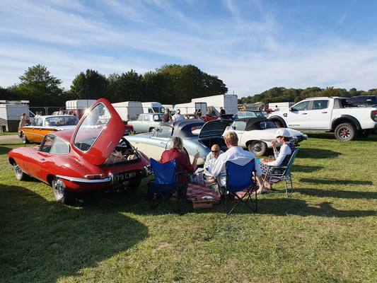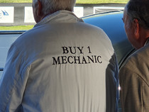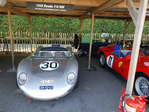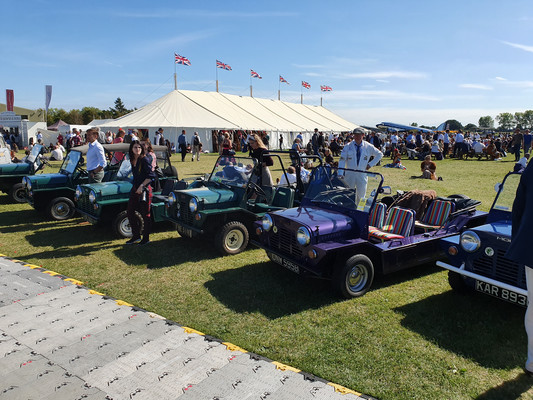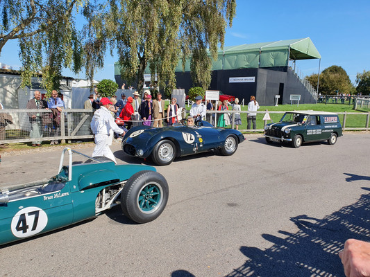 Das Goodwood Revival beschränkt sich natürlich nicht nur auf die Rennaktivitäten. 150000 Besucher amüsieren sich an jeder Ecke prächtig bei toller Live Musik mit Tanz, beim Shoppen bei an die 500 Anbietern jeden Genres, beim Verfolgen (mit Bieten) der Versteigerung, beim Autokino und schauen, schauen, schauen, z.B vor der Porsche Werkstatt, in der geschraubt und alle Stunde ein 356-Motor angelassen wurde. Auch die Paraden z.B. der anläßlich 60 Jahre Mini. 150 Mini der Baujahre 1959 bis 1968 in allen Versionen erzeugen nur Fröhlichkeit und so mache Erinnerung. Nur das Ablaufen des Parkplatzes der Besucher mit einem Fahrzeug bis Baujahr 1965 bringt nicht nur runde Füße, sondern auch mal ein Pläuschchen mit Picknickern auf der Decke oder Klappstühlen vor dem offenen Kofferraum ihrer Autos.