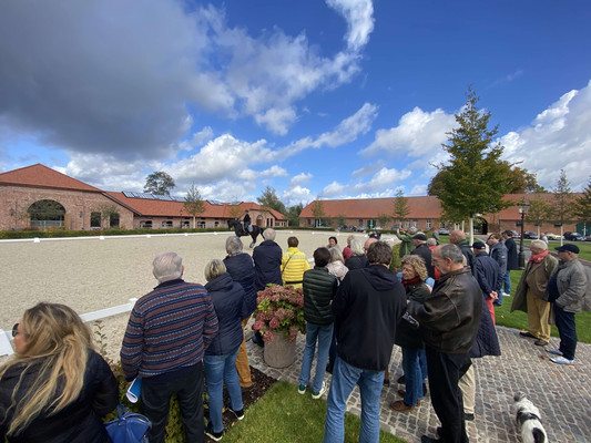 Nach einem Empfangsdrink in der Bar der Reithalle erhielten wir eine exklusive Dressur-Vorführung von 'Follow Him's, einem Prämienhengst der Oldenburger Körung 2017. Im Anschluss an die beeindruckende Dressur durften wir die Stallungen und die Zuchtstation besichtigen, wobei die Einrichtung der Zuchtstation sehr nüchtern war. Auf das Ambiente legen Hengste offenkundig keinen Wert.