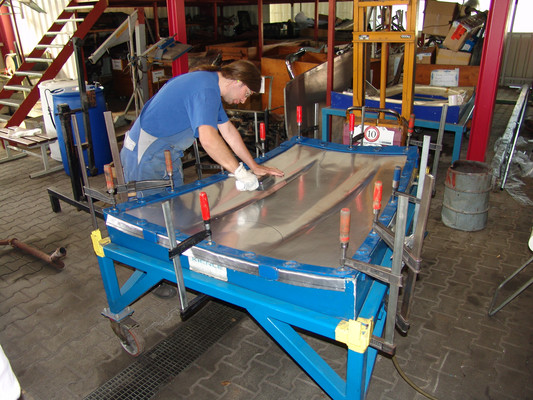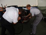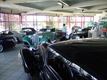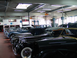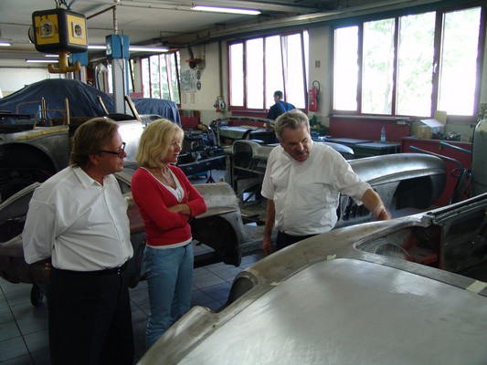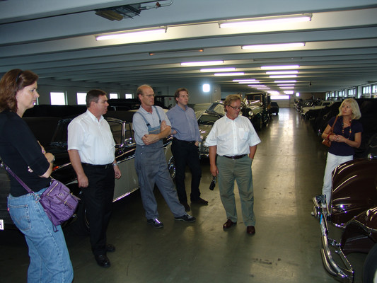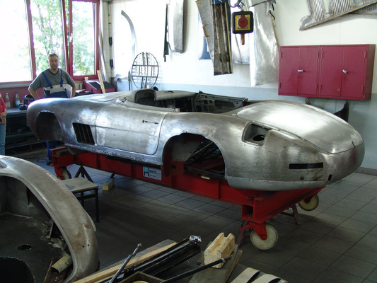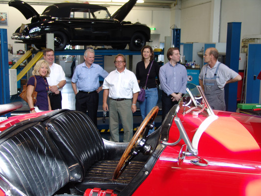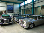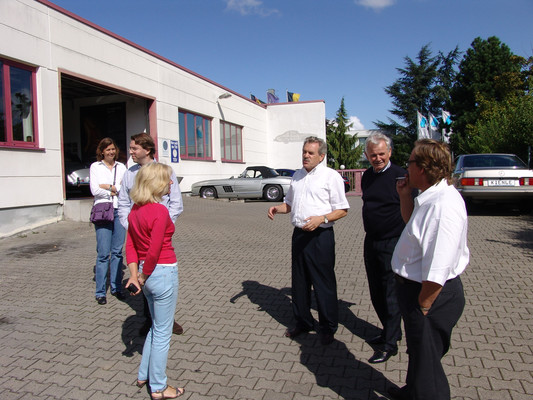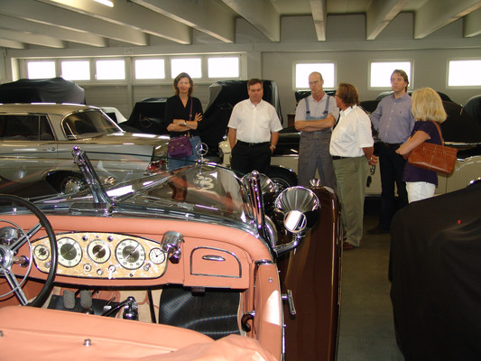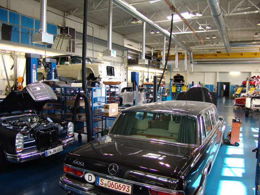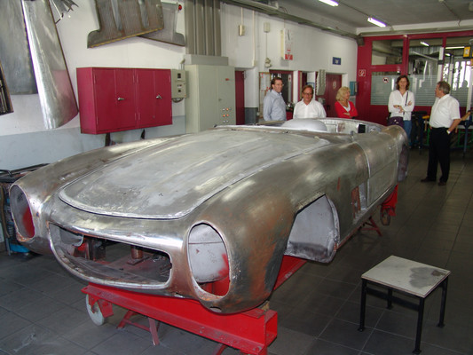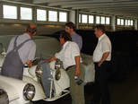 In der Werkstatt zeigten sich uns diverse 600er (kurz, lang, Landaulet, gepanzert etc.), 190SL, 300S, 300SC, 300SL, 280SL etc., die sich in unterschiedlich fortgeschrittenen Restaurierungsstadien befanden. In Sattlerei und Blechnerei konnten wir uns die Arbeiten an Kundenfahrzeugen im Detail ansehen.