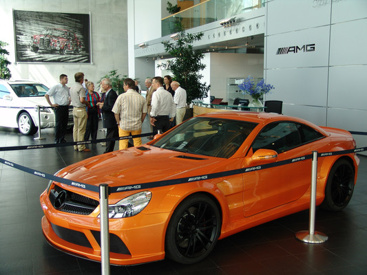 Nach einer kurzen Filmpräsentation war es endlich soweit. Der bei AMG gefertigte SLS (Flügeltürer) wurde enthüllt, das erst in 3 Wochen der Öffentlichkeit auf der IAA präsentiert wird. Das fachkundige Publikum nahm sich die nächsten 2 Stunden des Fahrzeugs an. Von Sympathie bis Antipathie waren alle Meinungen zu hören. Wie sich der Wagen letzendlich etablieren wird, wird die Zeit zeigen. Bei Verlassen des Showrooms sprachen einige Besucher bereits über den SLS Roadster, der vmtl. in 3 Jahren vorgestellt wird.