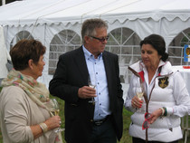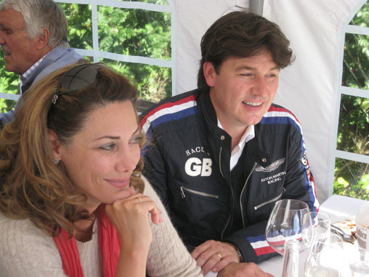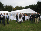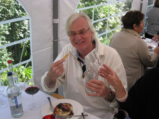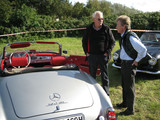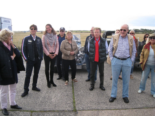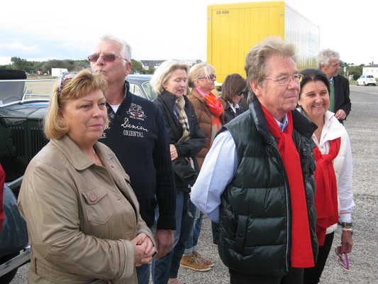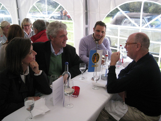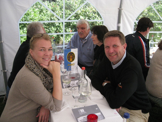 Denn um 12 Uhr erwartete uns hier als totale Überraschung das unvergessliche Highlight der Sylt Revival Tour 2013. In Morsum zeigten uns schon unsere neuen ASC Fahnen und große ASC-Schilder den Weg zu dem Anwesen unserer Gastgeber, unseren Schnauferlfreunden Evelyn und Peter A., die unsere Autos vor ein weißes Festzelt dirigierten. Die Tische waren mit feinem weißen Tuch eingedeckt. Vor jeweils vier Gläsern (!) lag Silberbesteck für 6 Gänge (!). Eine Crew von 12 Personen (!) umsorgte uns nun vom Allerfeinsten, um die Gaumen mit den im Nebenzelt von dem Sternekoch Holger Bodendorf vom Landhaus Stricker frisch zubereiteten Köstlichkeiten und den dazu passenden Weinen bester Lagen zu umschmeicheln. Mit dieser großartigen und großzügigen Überraschung hatte niemand gerechnet. Der Applaus für dieses Erlebnis war riesig. Insbesondere das vorzügliche Indonesische „Laksa“ mit Steinbutt hatte zur Folge, dass das Kochbuch des Herrn Bodendorf am Ende reißenden Absatz fand. Unseren Gastgebern sei hiermit noch einmal tausend Dank zugerufen.
