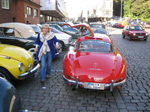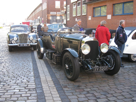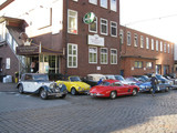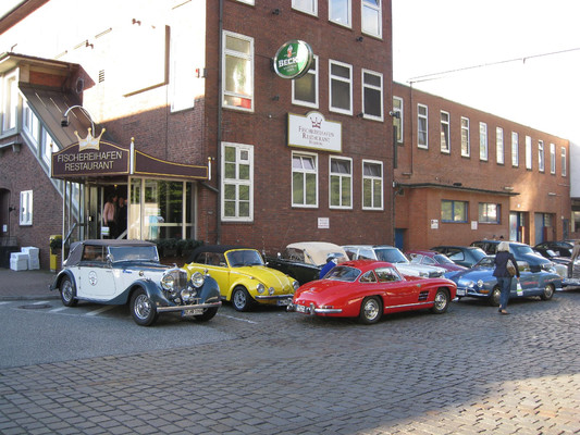 19 Fahrzeuge von ebensolcher Güte und Seltenheit wie bei unserer Hauptrallye fanden sich am Freitag ab 8 Uhr vor dem Fischereihafen Restaurant an der Elbe ein. Schon hier erlebten wir eine Besonderheit, denn das Restaurant mit direktem Blick auf den Hafen empfängt eigentlich nur Mittags- und Abendgäste. Für uns zauberte der Hausherr ein fürstliches Frühstück mit allerlei Meeres- und anderen Leckerbissen auf die direkt am Fenster eingedeckten Tische.